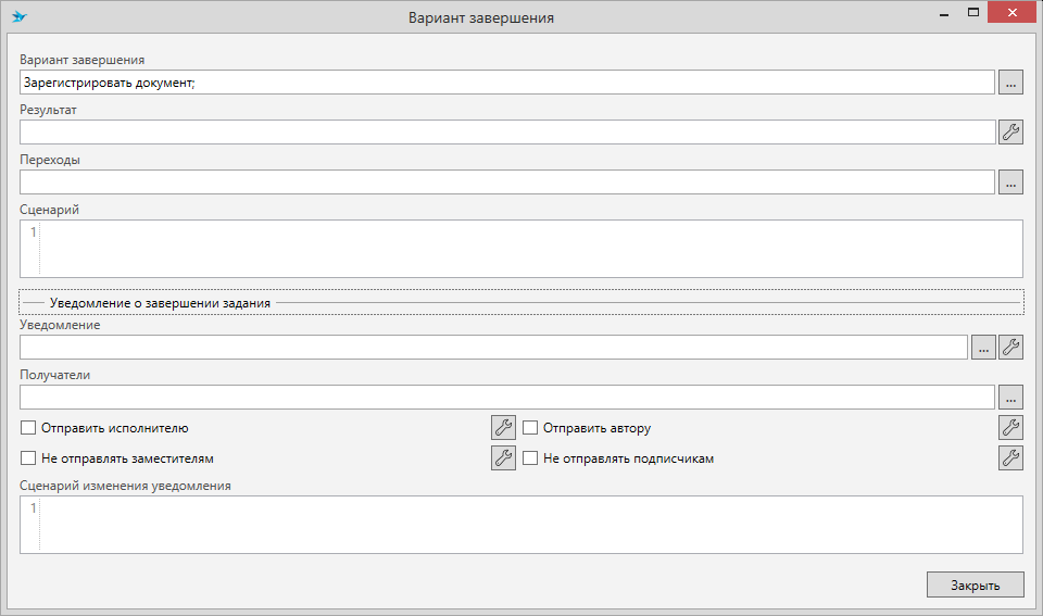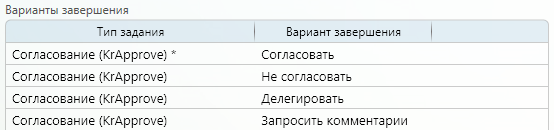 • Вариант завершения (значение из справочника вариантов завершений) - определяет, при завершении задания с каким вариантом завершения должна производиться обработка из данной строки таблицы.