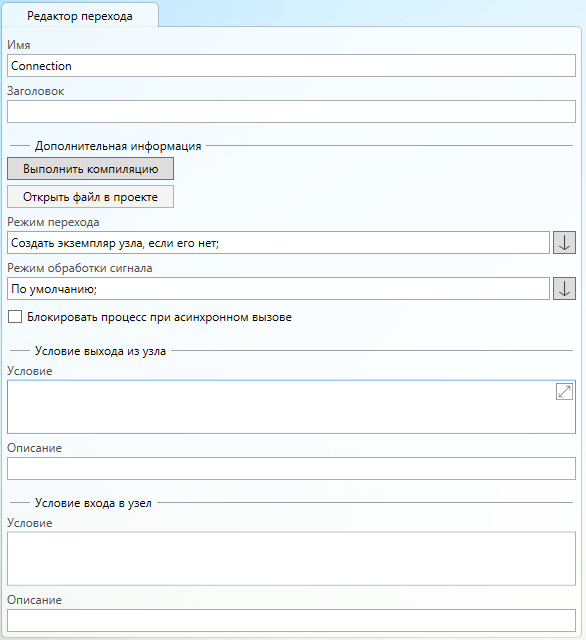 Редактор действия открывается из редактора экземпляра узла. В редакторе экземпляра действия доступна кнопка Назад, при нажатии которой открывается редактор экземпляра узла.