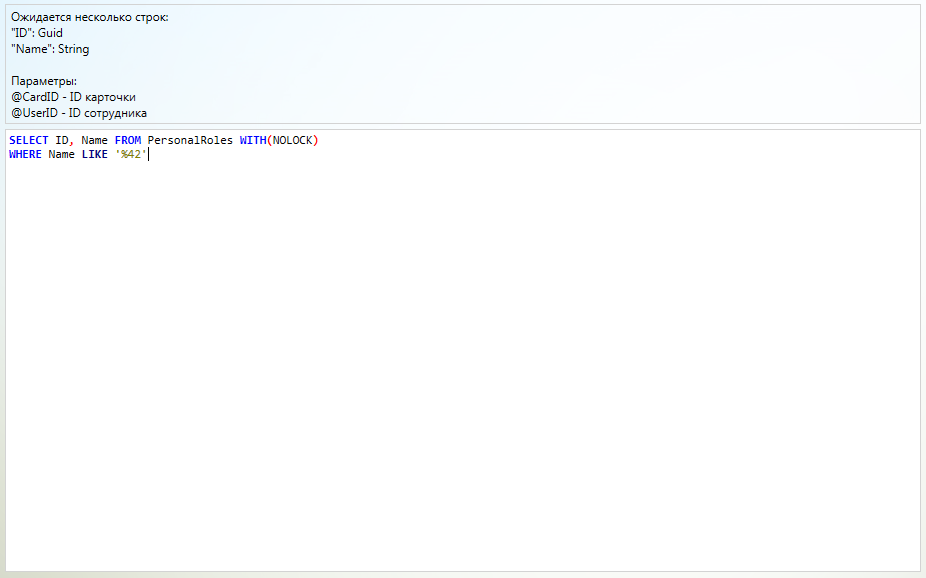 В редакторе есть подсказка, какие значения должен возвращать запрос, сколько строк ожидается от данного запроса и какие параметры можно в нем использовать.