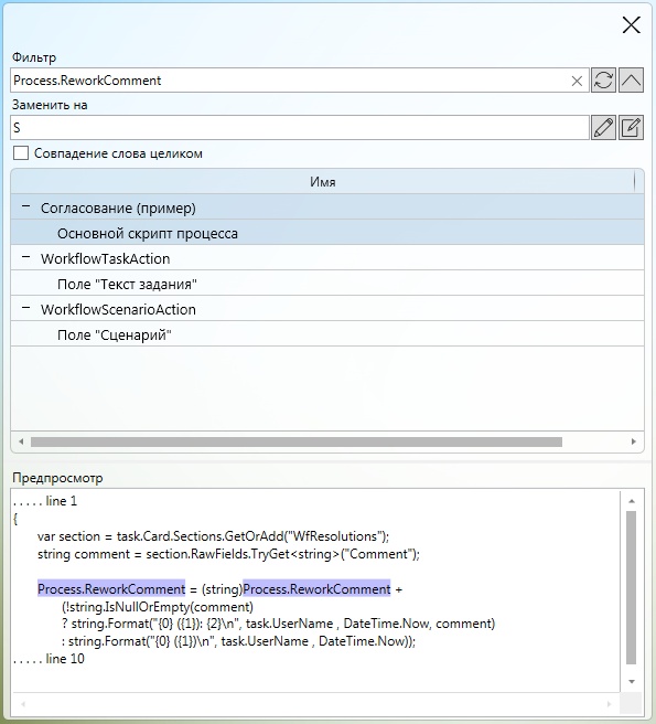 Таблица с результатом поиска - отображает все объекты, в которых была найдена искомая строка. В случае, когда искомая строка не задана, отображает все объекты шаблона процесса. Когда искомая строка задана, то для каждого объекта можно посмотреть места вхождения искомой строки, а также при выборе конкретного объекта или места вхождения отобразится окно с предпросмотром с подсветкой вхождения искомой строки.