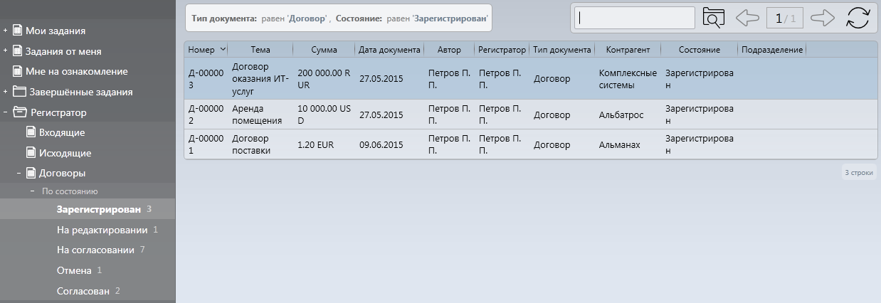 Для поиска карточек документов в системе можно использовать вложенные представления в папке “Регистратор” (при наличии соответствующих прав доступа) или представление “Мои документы” (отображаются все карточки, которые были созданы текущим сотрудником).