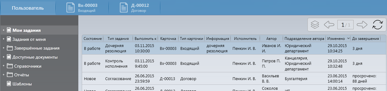 Для поиска карточек, в которых есть задания, отправленные текущим пользователем, или задания, где исполнителем является текущий пользователь, есть соответствующие представления: “Задания от меня”, “Мои задания” и “Завершенные задания”.