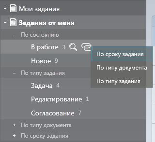 Раскрыв в дереве нужный узел, можно просмотреть список заданий, сгруппированных по определенным параметрам (например, по состоянию, по типу задания и т.д.). Можно добавлять вложенную группировку по различным полям, например задания в состоянии “В работе” сгруппировать “По сроку задания”.