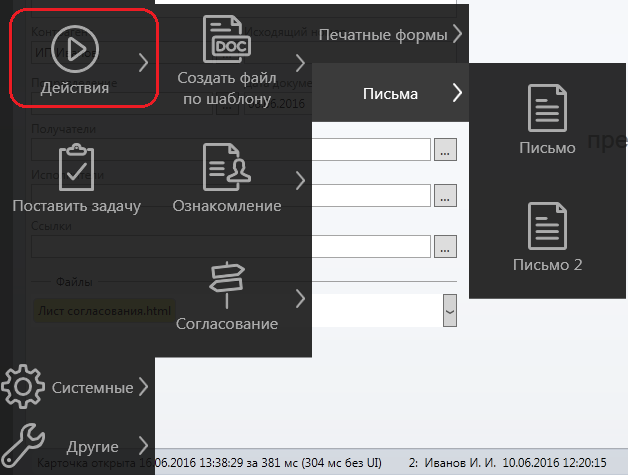В случае, если для данного типа карточки предусмотрено большое количество действий, то они будут сгруппированы в меню “Действия”, из которого можно вызвать создание файла по шаблону.
