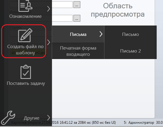 Для создания файла по шаблону необходимо выбрать нужное представление или открыть карточку и далее в левом меню системы нажать кнопку “Создать файл по шаблону”, выбрав нужный шаблон из списка доступных.
