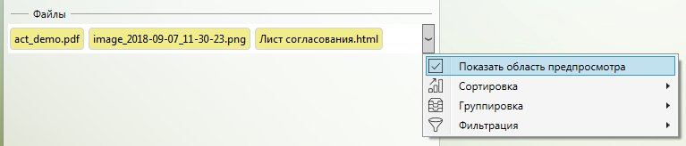 Также для просмотра файла в области предпросмотра (если таковая имеется в карточке) достаточно выбрать файл в списке файлов (нажав левой кнопкой мыши по нему один раз). Область предпросмотра можно скрыть/отобразить, нажав на соответствующие пункты контекстного меню в списке файлов.