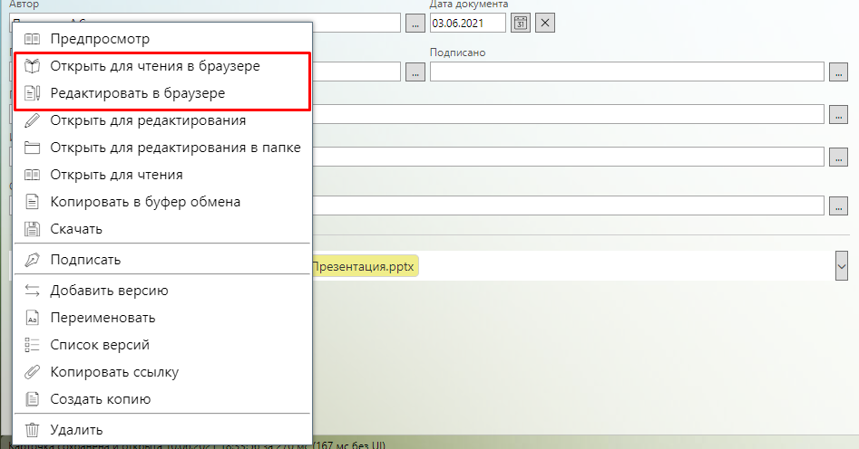 - Открыть для редактирования в браузере - документ откроется на редактирование в соседней вкладке браузера.