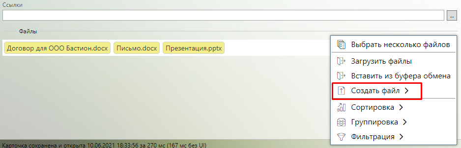 Также, при наличии прав на добавление файлов, будет доступен пункт “Создать файл” в меню файлового контрола:
