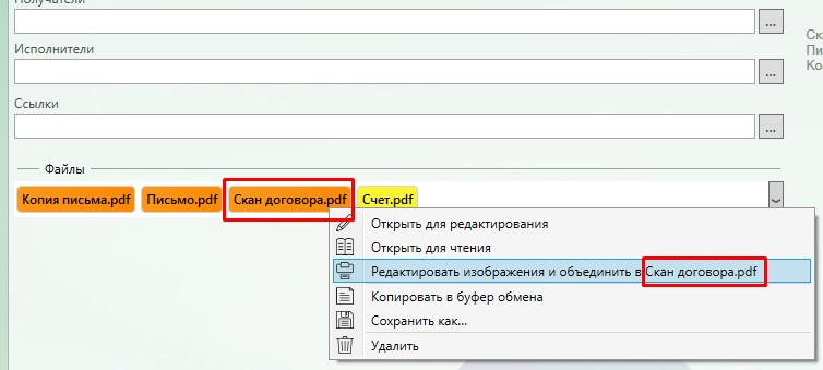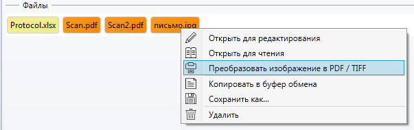 Несколько файлов изображений, добавленных в секцию “Файлы” карточки документа можно объединить и преобразовать в PDF или TIFF формат. Для объединения изображений необходимо, удерживая клавишу [Ctrl], выделить нужные файлы и далее в контекстном меню выбрать пункт “Преобразовать изображение в PDF/TIFF”.