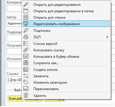 Также для PDF/TIFF файлов есть возможность редактирования, включая PDF файлы, созданные не в приложении Tessa. Для открытия окна редактирования необходимо в контекстном меню на файле выбрать пункт “Редактировать изображения”.