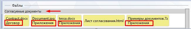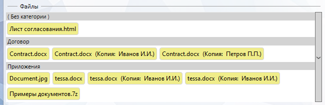 где в разделе “Согласуемые документы” отображаются все документы, которые были добавлены в карточку, за исключением копий файлов. При этом в данном разделе под названием файла отображается категория файла (если для данного типа карточки включены категории и у файла есть категория):