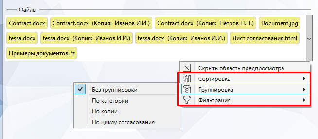 Для удобства работы список файлов имеет специальные инструменты управления отображением, такие как сортировка, группировка и фильтрация содержимого списка. Все три инструмента могут использоваться одновременно. Включаются данные инструменты в контекстном меню секции файлов: