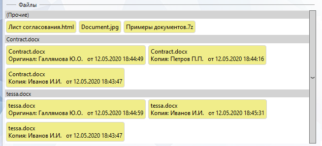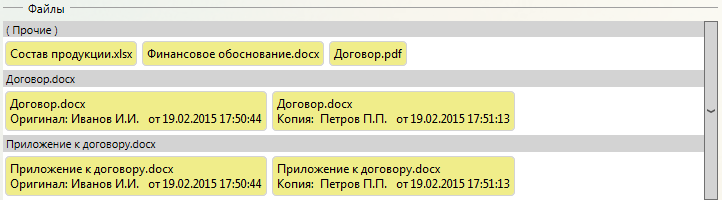 При открытии карточки документа в списке файлов может быть применена группировка и/или сортировка по умолчанию, настроенная администраторами системы. Подробное описание возможных видов группировки и сортировки в разделе Сортировка, группировка, фильтрация.