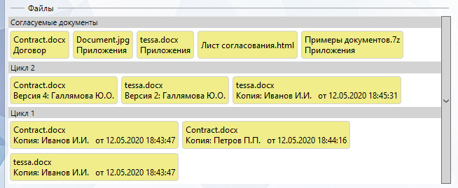 а в разделе с названием цикла отображаются созданные копии документов (с указанием ФИО создавшего и даты создания), а также виртуальные файлы - ссылки на версии согласуемых документов, которые редактировались или добавлялись в данном цикле. Т.е. всегда можно посмотреть на каком цикле какие документы были добавлены/отредактированы и как они выглядели в момент выполнения данного цикла маршрута.