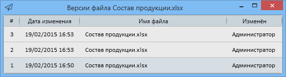 Список версий также открывается при помощи соответствующего пункта контекстного меню файла. Элементы списка версий так же имеют пункты “Открыть для чтения”, “Копировать ссылку”, “Сохранить как” и “Копировать в буфер обмена”. Двойное нажатие левой кнопки мыши на элементе списка версий вызывает открытие для чтения.