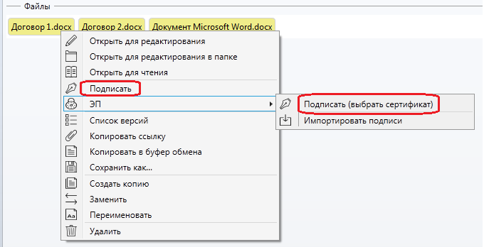 Подписать файл с помощью электронно цифровой подписи можно нажав правую кнопку мыши на файле и выбрав пункт меню “Подписать” (или “ЭП” → “Подписать (выбрать сертификат)”, если требуется выбрать другой сертификат).