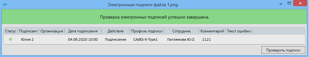 Подпись будет проверяться для последней актуальной версии файла. В открывшемся окне будет отображен результат проверки.