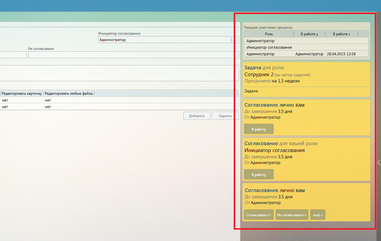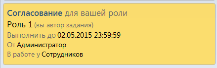 После взятия задания в работу, другие пользователи, входящие в роль, будут видеть задание взятым в работу и не будут видеть это задание в представлении “Мои задания”.