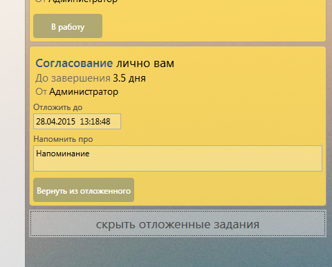 При наступлении указанной при откладывании задания даты, задание будет возвращено в работу, а пользователь получит уведомление на электронную почту, которое будет содержать номер документа, тему, тип задания, информацию кто и когда отложил его и текст напоминания (указанный при откладывании задания).