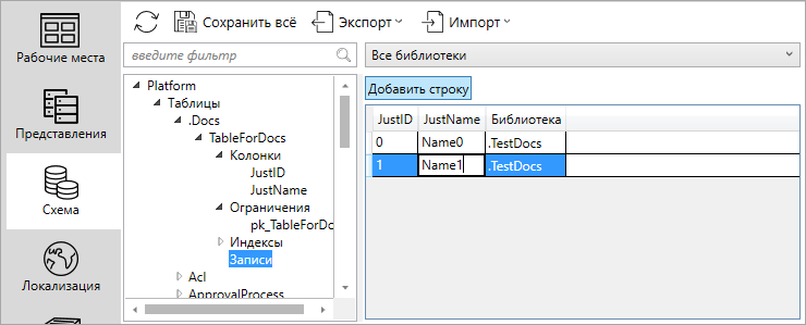 Чтобы добавить запись, нужно нажать на кнопку Добавить строку, заполнить пустое поле (необходимо выделить поле левой кнопкой мыши и ввести значение) и нажать Enter.