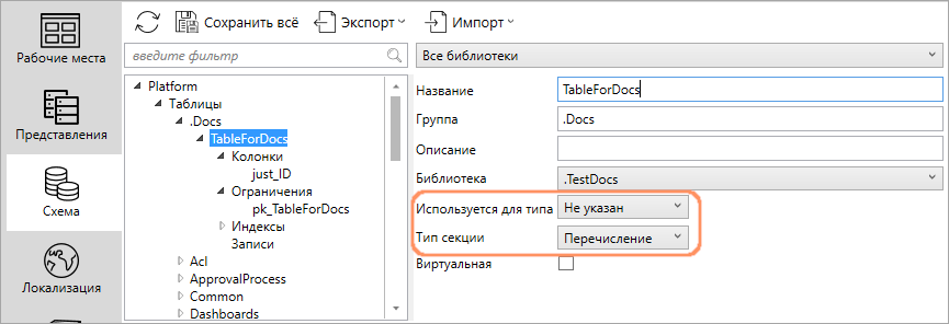 Шаг 1: Создание таблицы со свойствами Используется для типа - Не указан и Тип секции - Перечисление.