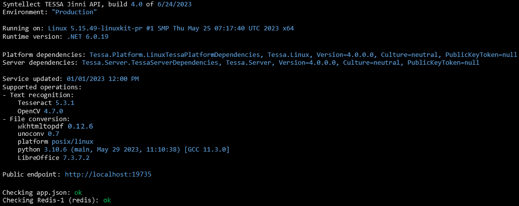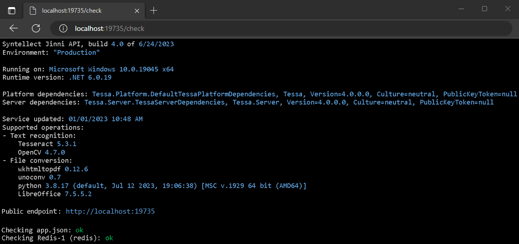 На хост-машине или из любого другого компонента системы (например, Chronos или веб-сервис TESSA) выполните запрос по адресу http://localhost:19735/check.