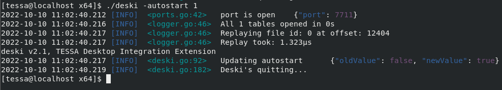 $HOME/.config/autostart/deski.desktopсо следующим содержимым (USER_NAMEзамените на имя учётной записи пользователя):[Desktop Entry] Type=Application Name=TESSA Desktop Integration Extension Exec="/home/USER_NAME/deski/deski" "-dont-open-browser" X-GNOME-Autostart-enabled=true