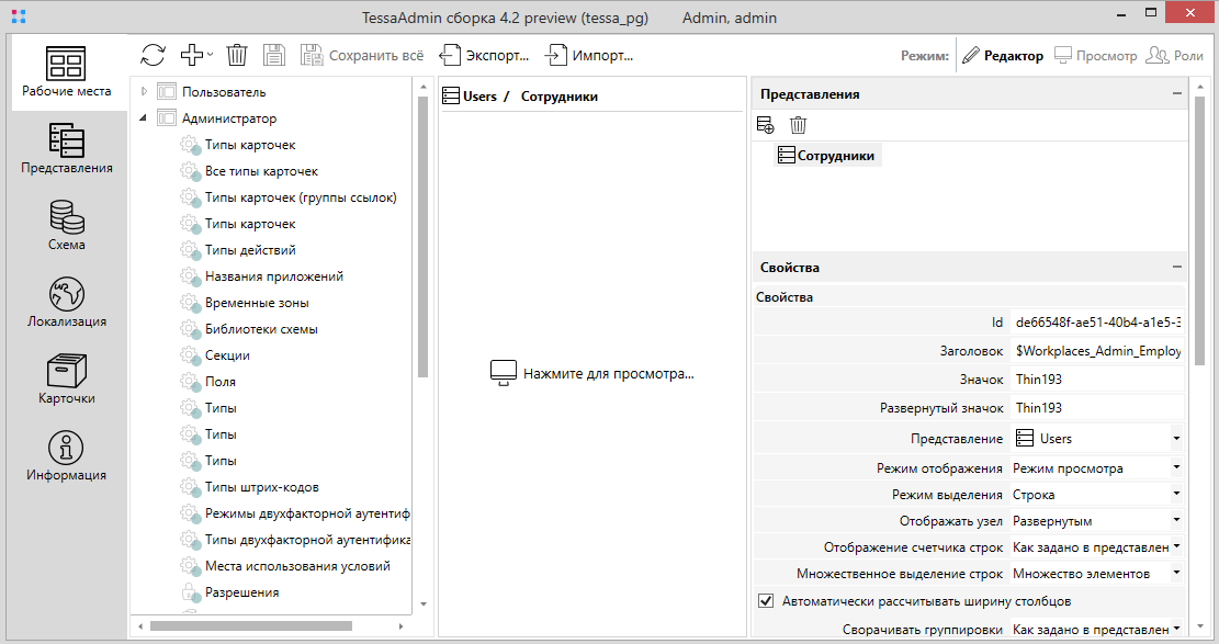 Перед предпросмотром необходимо сохранить изменения кнопкой Сохранить всё и перейти в область предпросмотра по кнопке Просмотр в панели инструментов. Эта область показывает, как выглядит рабочее место для пользователя.