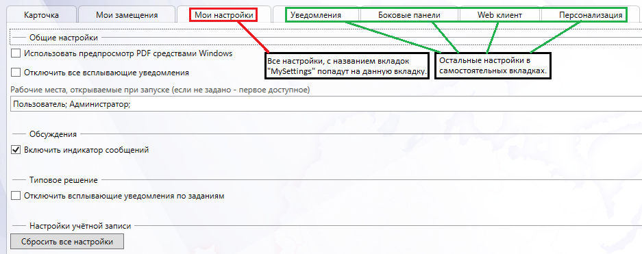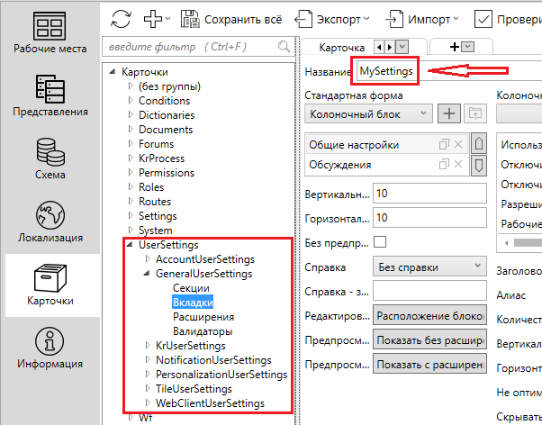 Для типов карточек “Настроек пользователя” (UserSettings) наименование вкладок, блоки из которых необходимо добавить во вкладку Мои настройки, должны иметь название MySettings.