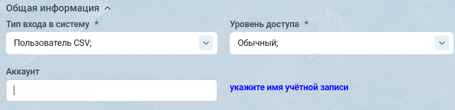 В поле “Аккаунт” задайте один из логинов в CSV-файле, например, user1. Сохраните карточку.