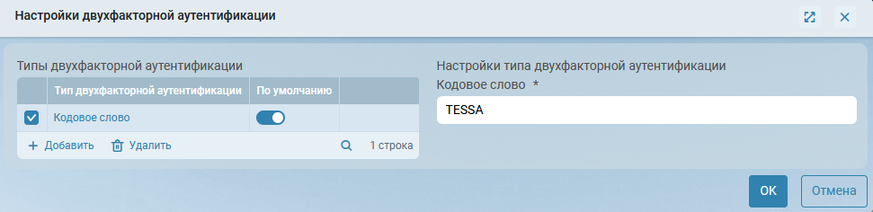 Для текущего сотрудника в диалоге Мои настройки или в карточке сотрудника (для другого сотрудника, которому необходимо настроить двухфакторную аутентификацию) откройте диалог с настройками типов 2FA по кнопке Настройки двухфакторной аутентификации. В таблице добавьте тип 2FA со значением Кодовое слово и введите слово для его последующей проверки при входе в систему.