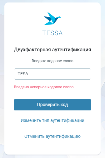Зайдите под пользователем, для которого были произведены настройки типа 2FA, описанные выше. Убедитесь, что после прохождения первого фактора аутентификации (корректные логин/пароль и др.) отображается окно для подтверждения кодового слова с корректной проверкой.