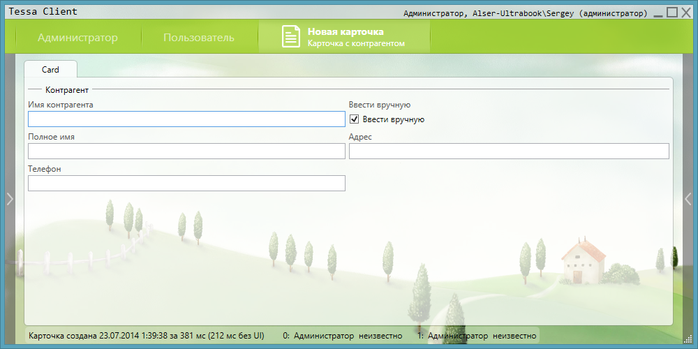 Пользователь вводит всю инфу о контрагенте вручную. Если он опять сбросит галку “Ввести вручную”, то опять появится автокомплит и очистятся значения всех полей.