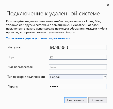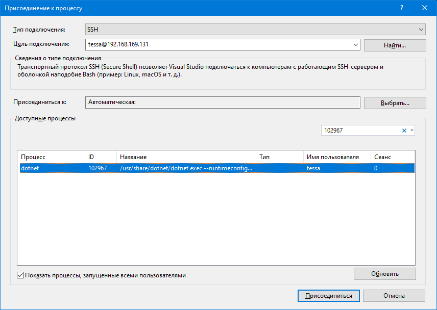 Для удалённой отладки потребуется установить SSH-сервер. Подробнее см. в Удаленная отладка .NET в Linux с помощью SSH.