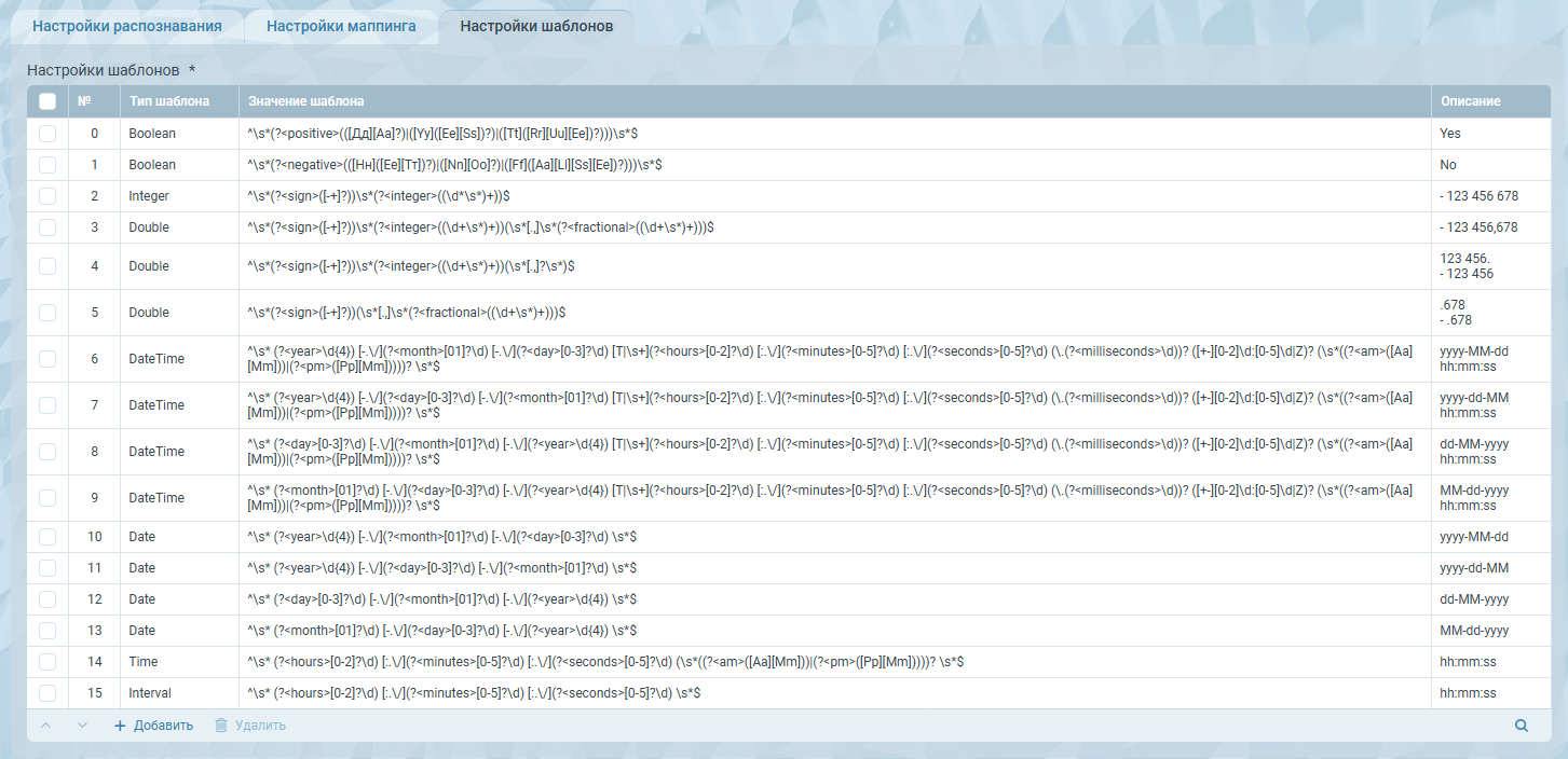 | Настройки шаблонов | Таблица с шаблонами в виде регулярных выражений, которые используются при верификации значений в полях карточки операции OCR |