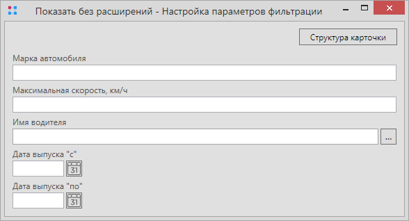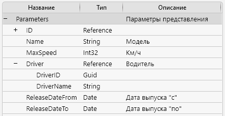 Для отображения параметров фильтрации воспользуемся виртуальной карточкой имеющей тип диалог. Виртуальная схема состоит из одной строковой секции Parameters. Она содержит колонки соответствующие параметрам представления AbCars.