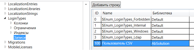 Все доступные типы входа должны быть указаны в таблице-перечислении LoginTypes. Откроем эту таблицу и добавим в неё строку с значениями в колонках: идентификатор 100, имя Пользователь CSV, библиотека AbSolution.