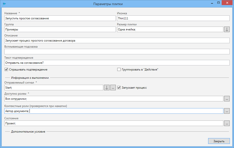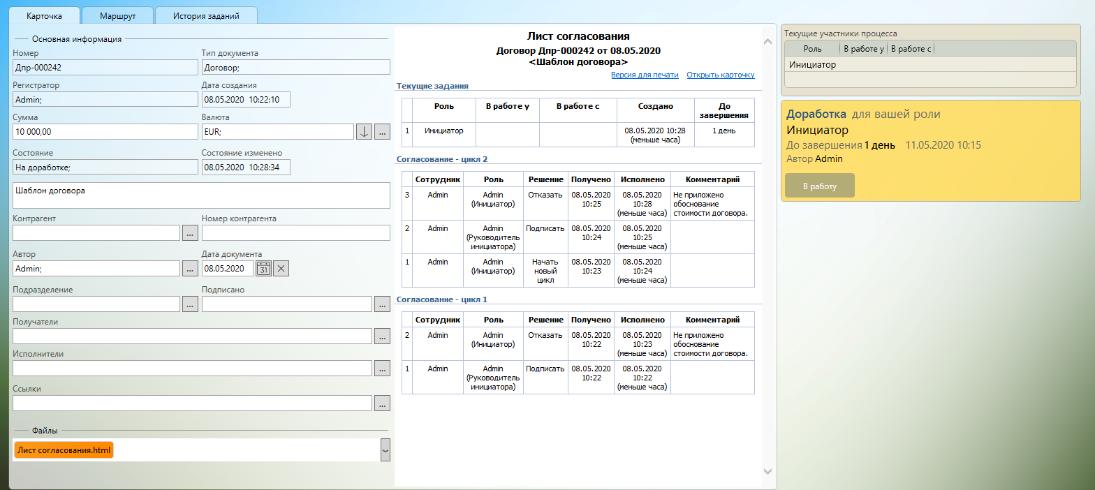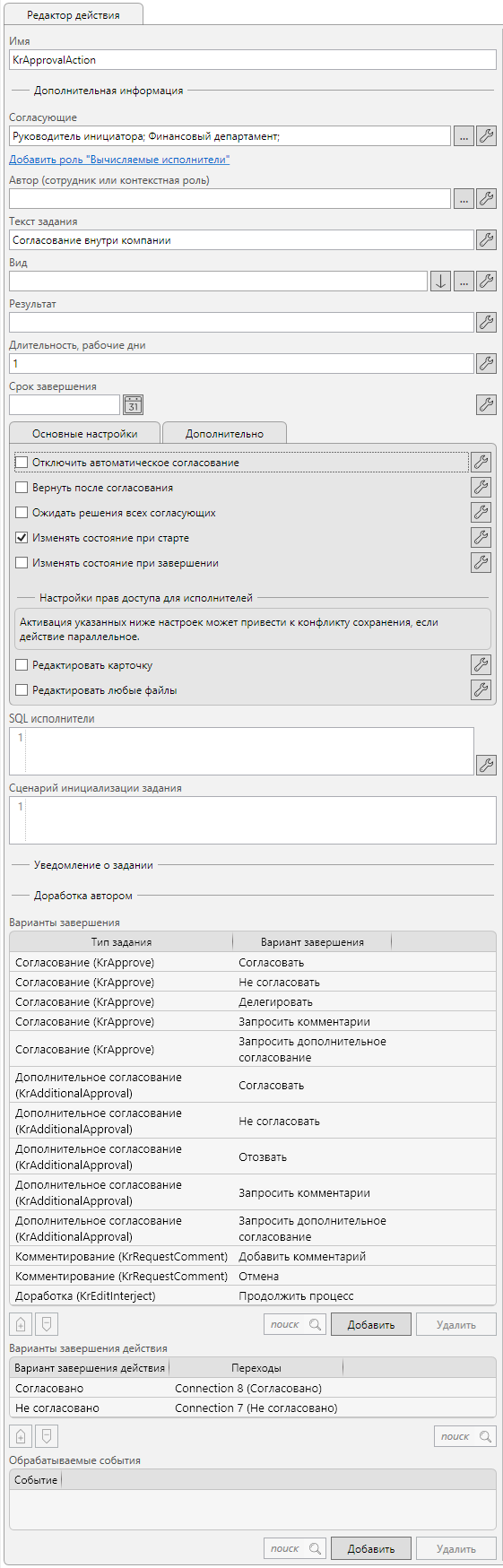 Это пример поэтапного создания процесса со своими настройками, где используется стандартное действие “Задание”. Однако для заданий согласования и доработки удобно использовать соответствующие действия из группы “Маршруты”, т.к. в них уже заложено много функциональности, например, запрос дополнительного согласования, делегирование и т.п. Примеры с использованием действий группы “Маршруты” описаны в следующем разделе.