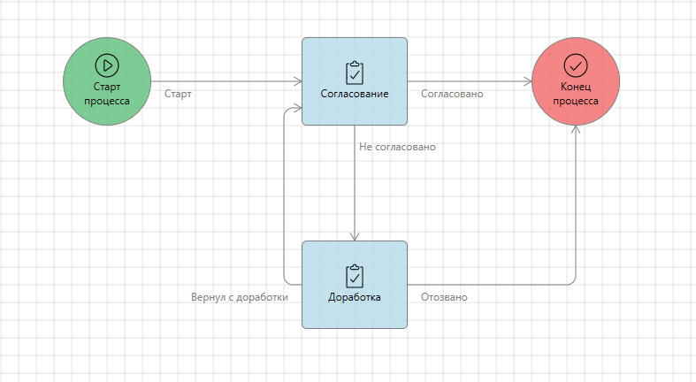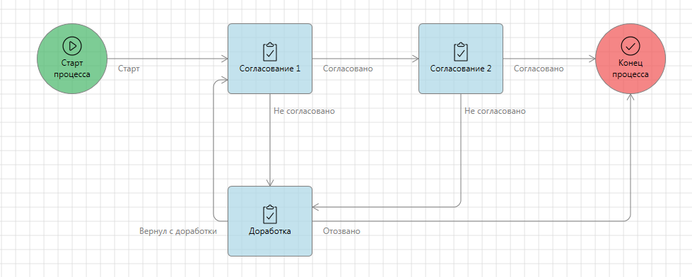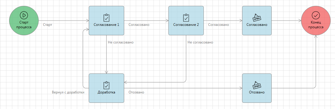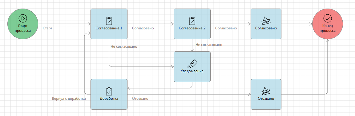 В итоге мы получили процесс с двумя последовательными согласованиями, сменой состояний, отправкой уведомления и отзывом согласования.