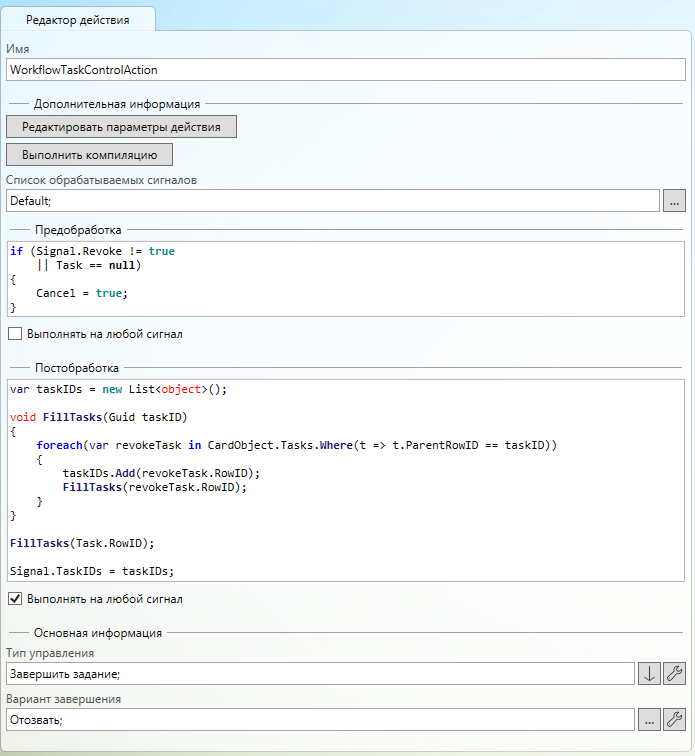 В качестве типа сигнала введем кастомный тип сигнала Revoke (его можно вводить вручную или добавить в перечисление WorkflowSignalTypes в схеме в рамках проекта).