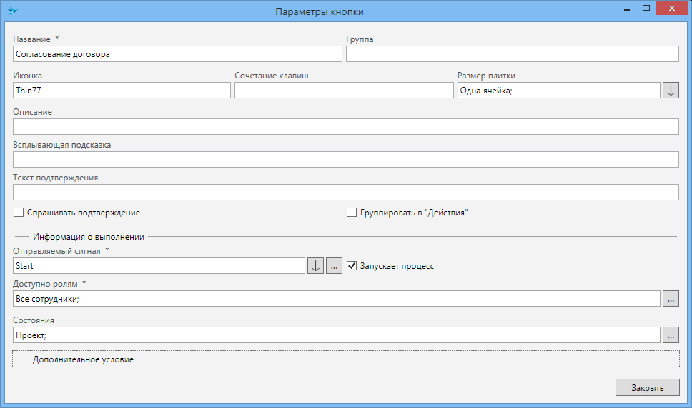 Действие Старт процесса дополнительно настраивать не нужно, т.к. по умолчанию оно ожидает сигнал с типом Start, который мы указали для нашей кнопки запуска процесса.