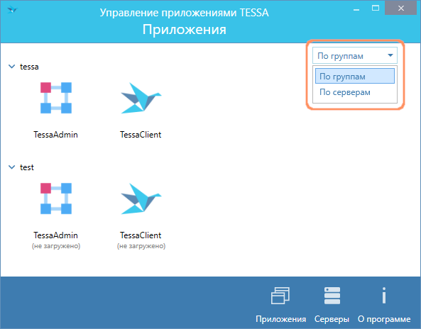 После обновления в Tessa Applications приложения будут сгруппированы. Можно выбрать группировку по серверам или по группам: