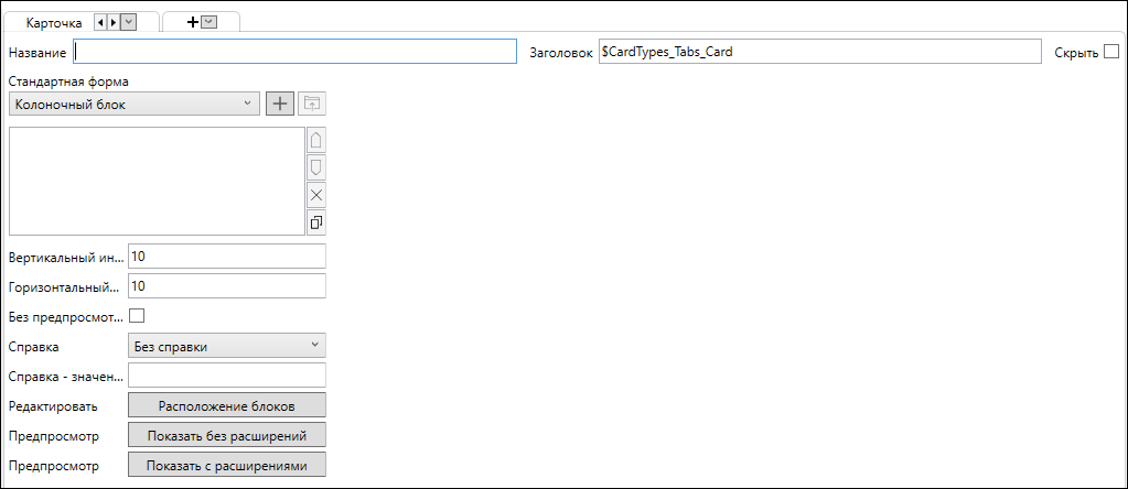 Расширение типа карточки и диалога, которое скрывает указанную в поле Название вкладки вкладку.
