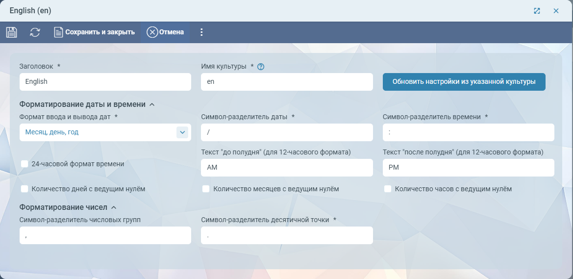 - Заголовок - отображаемое пользователю имя параметров форматирования. Может быть любой строкой, в т.ч. неуникальной. Обычно это название культуры (языка), заданной в поле Имя культуры.