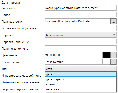В контроле “Дата и время” в зависимости от настройки отображения Тип определяется, будет ли выполняться ввод и вывод даты и времени, даты без времени, времени без даты или интервала. При этом применяются параметры форматирования, аналогичные таковым для параметров фильтрации представлений.