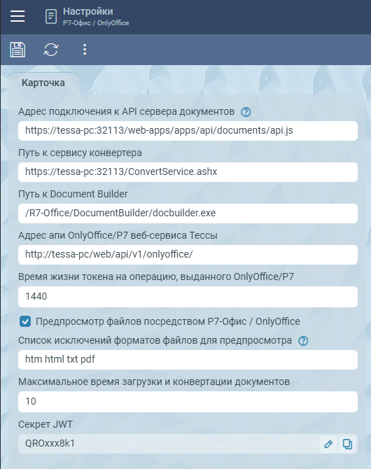 • Секрет JWT - значение секрета JWT, которое установлено в Р7-Офис / OnlyOffice. Может быть пустым, если токены не используются в Р7-Офис / OnlyOffice. Значение секрета показывается в искаженном виде. Для получение секрета надо нажать на кнопку Копировать. Для установки нового секрета надо нажать на кнопку Редактировать.