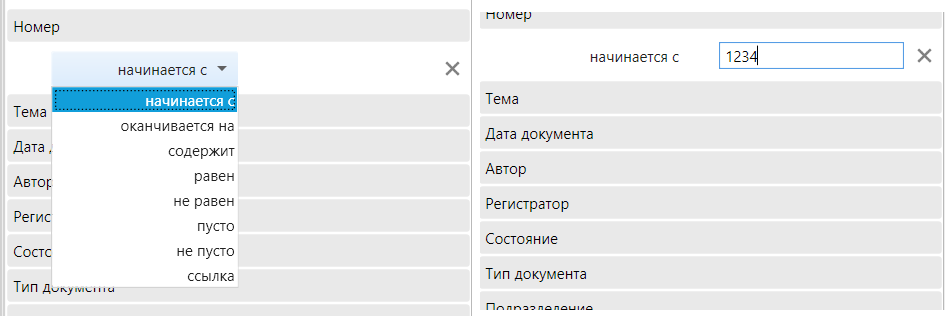 Для добавления параметра необходимо щелкнуть по строке, содержащей его имя, и выбрать условие отбора из выпадающего списка, затем указать значение параметра.