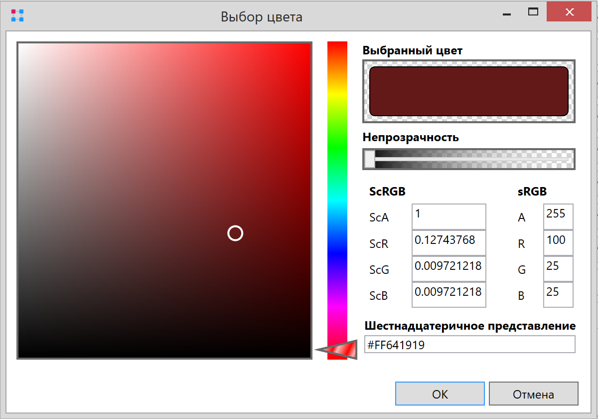 . При нажатии на кнопку откроется окно выбора цвета с соответствующими настройками: