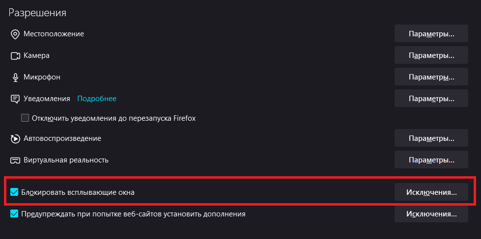Более подробно о настройке всплывающих окон в Firefox можно прочитать в справке Firefox.