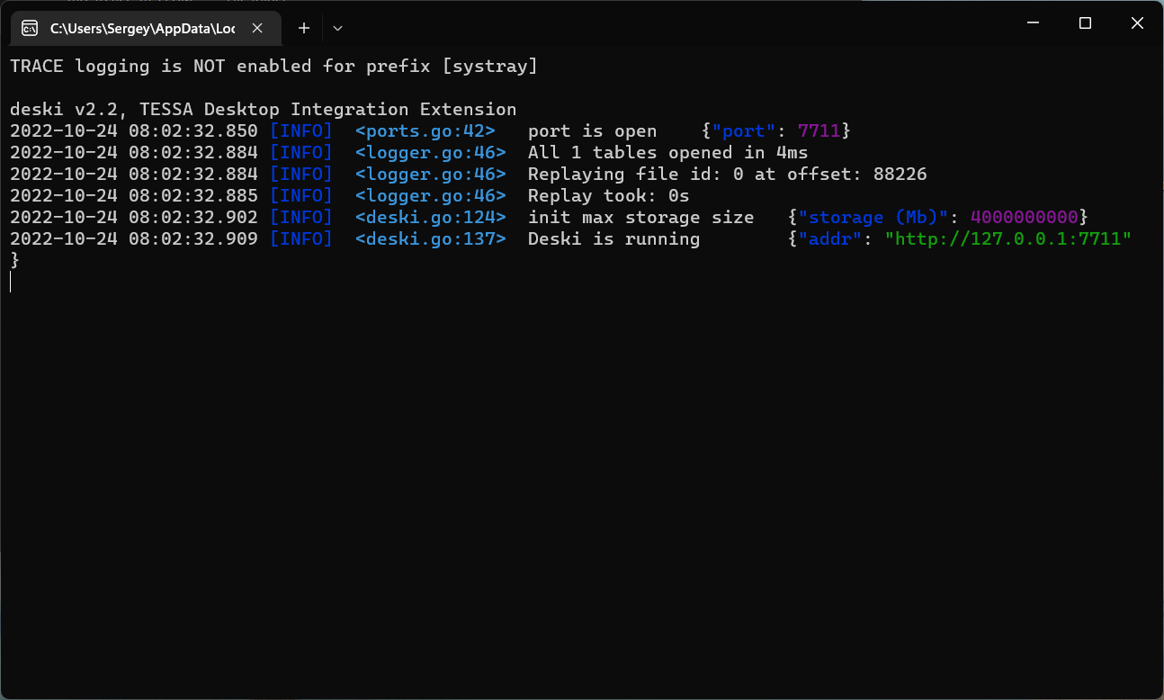 Убедитесь, что установлен Deski версии v2.2 или старше. Версию можно увидеть как в окне терминала, так и по кнопке “Открыть в браузере” в контекстном меню на иконке в трее.